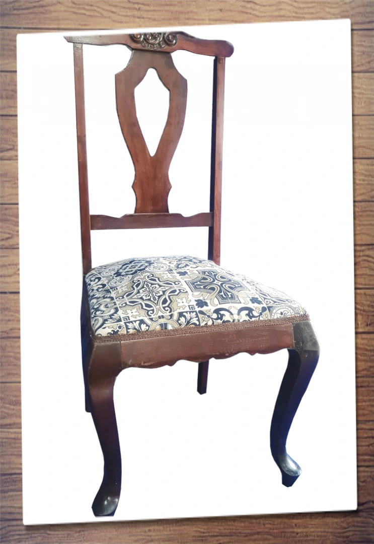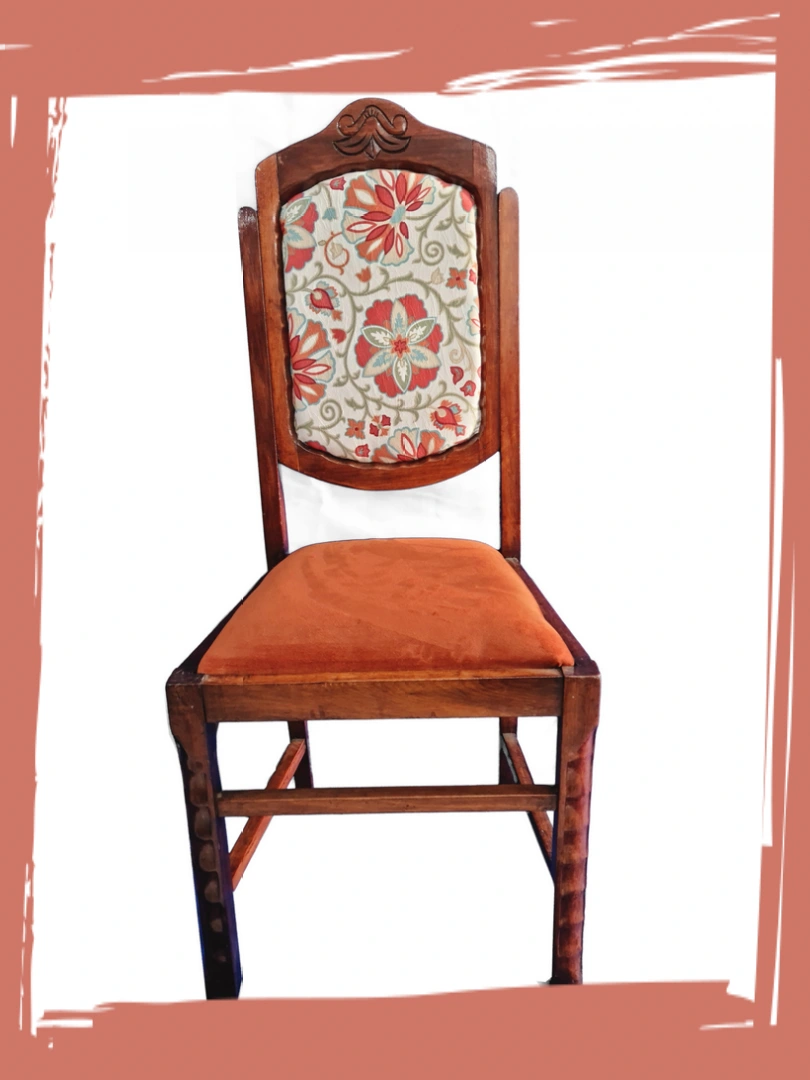 Cadeira de madeira maciça estilo pastoral com assento aveludado e encosto estampado