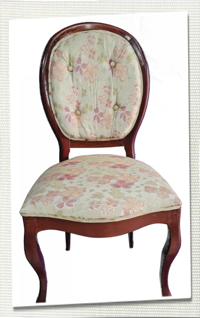 Cadeira medalhão em madeira maciça, sem braço, com assento e enconsto estampado em motivo floral