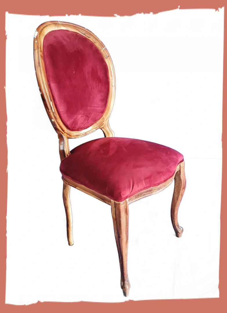 Cadeira medalhão em madeira maciça, sem braço, com assento e encosto em suede bordô