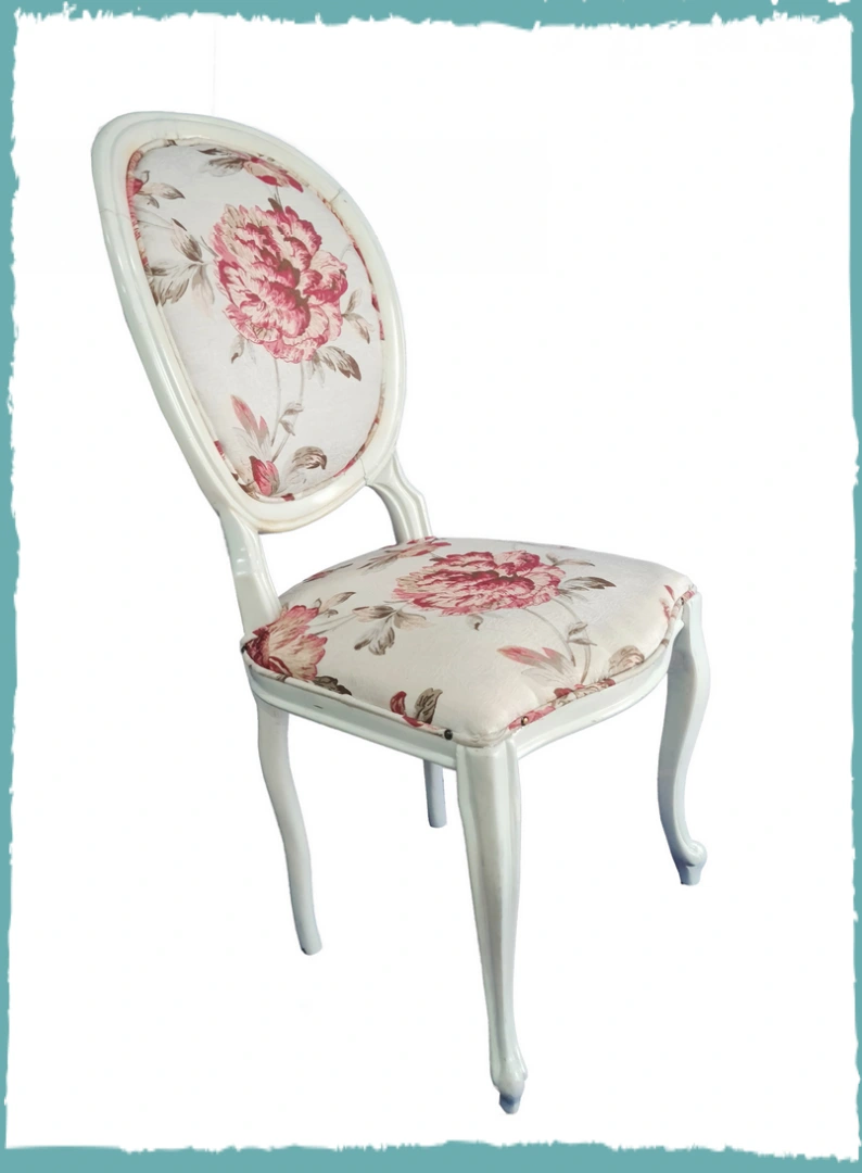 Cadeira medalhão branca em madeira maciça, sem braço, com assento e enconsto estampado motivo floral