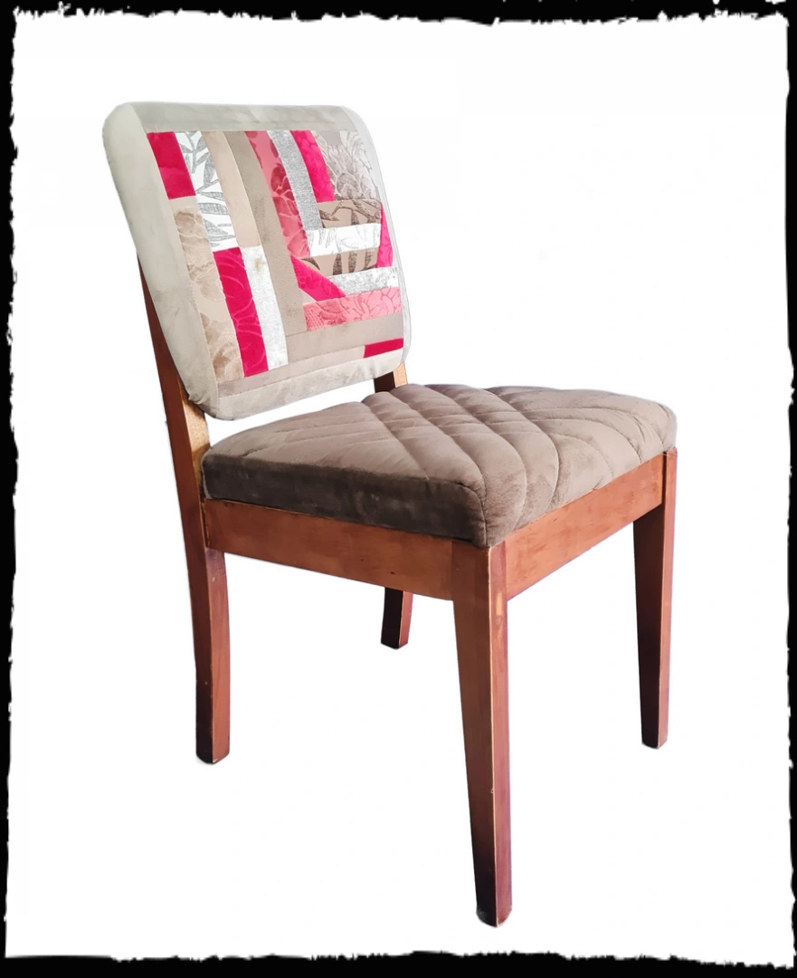 Cadeira breton em madeira maciça, assento em suede marron e encosto em patchwork